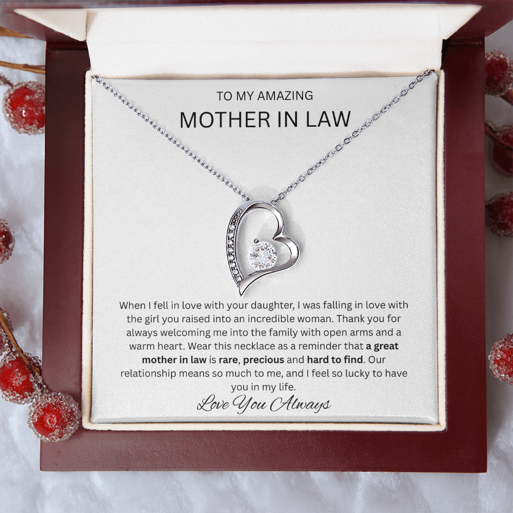 When I fell in love with your daughter, I was falling in love with the girl you raised into an incredible woman. Thank you for always welcoming me into the family with open arms and a warm heart. Wear this necklace as a reminder that a great mother in law is rare, precious and hard to find. Our relationship means so much to me, and I feel so lucky to have you in my life. The Forever Love Necklace is a simple way to say what words never could - thank you for everything. This necklace features a stunning 6.5mm CZ crystal surrounded by a polished heart pendant embellished with smaller crystals to add extra sparkle and shine. Beautifully crafted with either a white gold or yellow gold finish, be sure to give her a classic gift she can enjoy everyday.